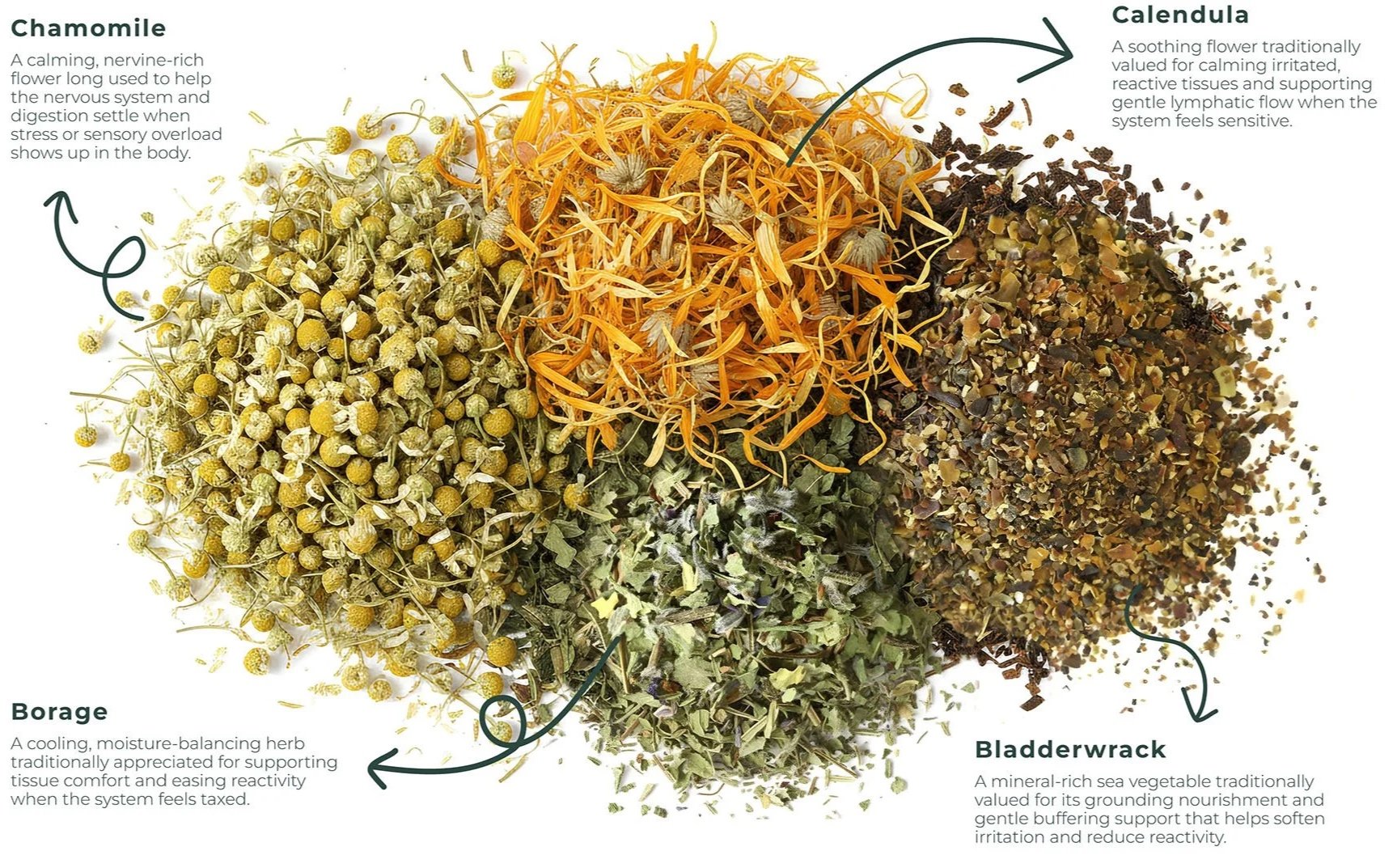 Caution should be taken to avoid contact with the eyes, as small flower hairs may cause eye irritation if the tea is not fully strained. Seaweeds naturally contain iodine and may include small sea fragments. Please avoid this product if you have fish or shellfish allergies. Packaged in a facility that processes tree nuts, but not on the same equipment. Persons with allergies to calendula, chamomile, or other members of the Asteraceae family should exercise caution. Not recommended for long-term or high-dose use, or during pregnancy, without guidance from a qualified healthcare practitioner.Sourcing: